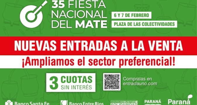 Ante la alta demanda de tickets, el Municipio de Paraná incrementó el cupo de localidades para el área exclusiva de la 35ª edición de la Fiesta Nacional del Mate. Las nuevas entradas ya están disponibles para las jornadas del 6 y 7 de febrero en la Plaza de las Colectividades.