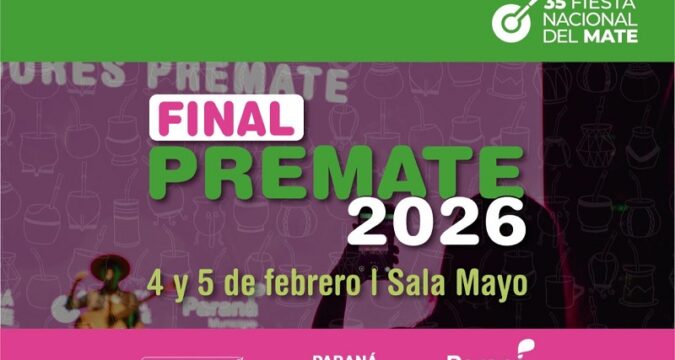 La instancia final del concurso artístico Pre Mate se llevará a cabo los días miércoles 4 y jueves 5 de febrero en la Sala Mayo de Paraná. El evento, que comenzará a las 20:00 horas con entrada libre y gratuita, determinará qué artistas integrarán la cartelera oficial de la 35.ª Fiesta Nacional del Mate en el escenario Luis «Pacha» Rodríguez.